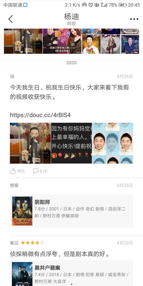 那天,我在豆瓣上闲逛,突然看到一个热门话题:“杨迪视频下载,你看了吗?”点进去一看,原来是一个关于杨迪的视频在网络上引起了轩然大波。视频里,杨迪的表现可谓是风趣幽默,让人捧腹大笑。这不,网友们纷纷在评论区留言,讨论着这个视频的精彩之处。